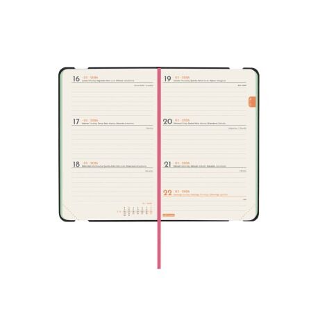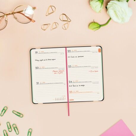 Agenda encuadernada de tapa blanda amb material de tacto suave y agradable. Con diseños en tendencia y a la moda e impresión en el perímetro de las hojas. Perfecta apertura para poder escribir cómodamente. Con goma elástica y cinta punto. Esquinas microperforadas para localizar rápidamente el día/semana en curso. Para facilitar la localización de cada mes, la anualidad incorpora un indicador en la parte superior de las páginas. La anualidad incluye información de interés y otros contenidos extra.