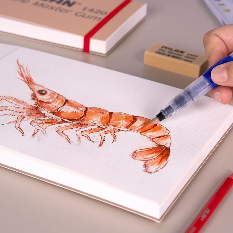 Block de dibujo A5 para acuarela con 30 hojas. Papel de alta calidad libre de ácido, prensado en frío y libre de cloro. Gramaje de 300 g/m² con un 25% de algodón que ofrece una gran absorción y resistencia, y mantiene los colores vibrantes. Color blanco natural y textura de grano fino. Ideal para artistas de todos los niveles. Gran versatilidad para técnicas secas y húmedas y aplicaciones mixtas, como acuarelas, acrílicos, gouache, lápices de colores y grafito, carboncillos, pasteles, plumas de tinta y rotuladores. Las hojas están encoladas en un borde lateral y se separan fácilmente. Tapa blanda y cubierta trasera dura para mayor estabilidad y protección. Apertura plana. Cinta de goma que mantiene el bloque cerrado para proteger su contenido. Tamaño práctico y fácil de transportar para poder pintar en cualquier lugar y llevar en viajes. Inspirado en los colores y diseño original de la goma de borrar profesional MILAN 1420 the Master Gum. Medidas: 21 x 14,8 x 2,16 cm. Peso: 0,37 kg.
