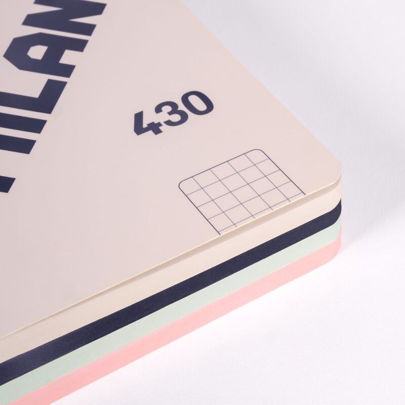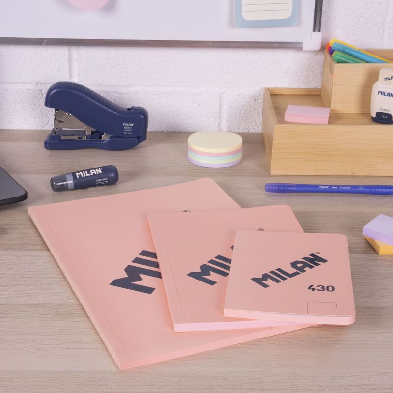 Libreta A6 encolada (sin grapas) y tapa flexible. 48 hojas de papel cuadriculado (5 x 5 mm). Papel de 95 gr/m² de alta calidad, microperforado. Cubierta de cartón flexible y logotipo MILAN brillante en relieve. Color rosa. Colección 430 since 1918, inspirada en los colores y diseño originales de las gomas de borrar MILAN, fabricadas en España desde 1918. Medida A6 (10,5 x 14,8 x 2 cm).