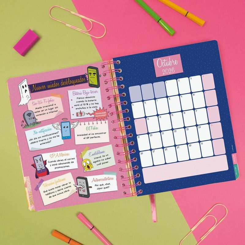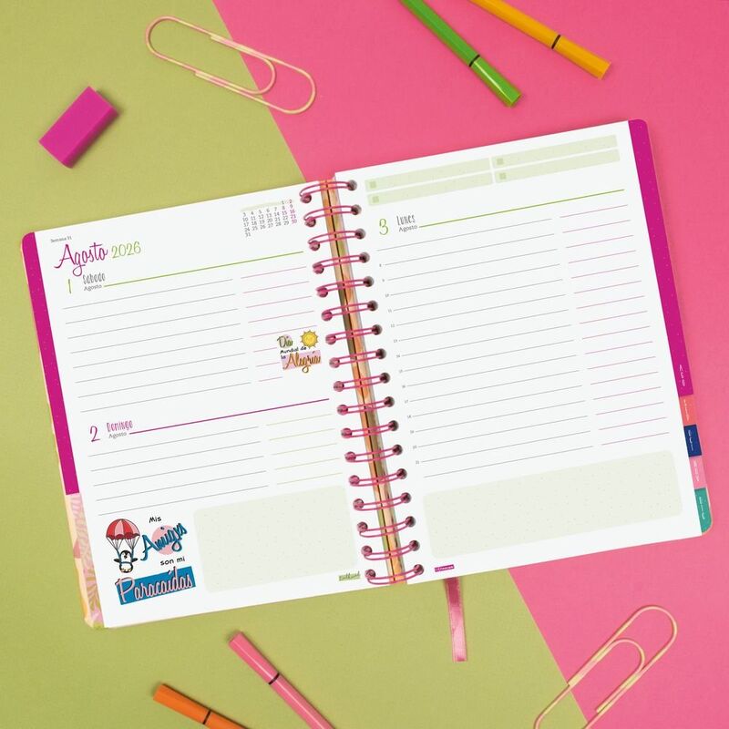 Agenda de tapa dura con detalles de estampación metálica. Con espiral doble y goma elástica suave. Dispone de pestañas mensuales troqueladas para acceder fácilmente al mes que desees y cinta punto para que localices rápidamente el día/semana en curso. La agenda TALKUAL es para gente real, única y genuina como tú. El diseño es a todo color y todo el contenido temático está pensado para darle a tu vida un toque de entretenimiento. Además, dispone de accesorios vitales para disfrutar organizándote: un set de notas engomadas de quita y pon, pegatinas temáticas y una funda decorada ideal para salvaguardar papeles, tarjetas, clips u otros indispensables vitales para llevar contigo. Sin duda, íesta es tu agenda! Porque tu singularidad marca la diferencia. Muéstrate #Talkual, #talkualsoy. Somos TALKUAL. Formato similar a DIN A5; con las ventajas de una agenda portable y una de sobremesa. Duración: Enero 2026 Diciembre 2026 (12 meses). Interior: 1 Día Página. Amplio espacio de escritura para c.
