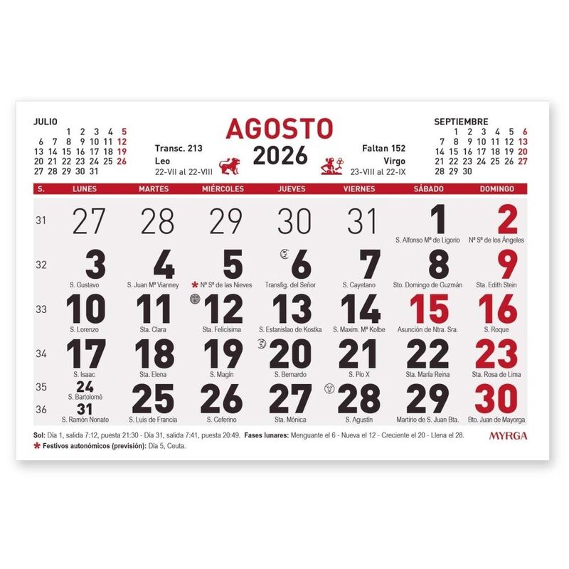 Calendarios mensuales de 32 páginas. Tamaño 15 x 10,5 cm papel offset 100 g/m2 F5C. - 32 páginas, papel offset 100 g/m2 FSC . Festivos nacionales, autonómicos e internacionales -fases lunares y salida y puesta del sol, - planning del año (excepto 1591), · santoral y signos del zodiaco y otros datos (calendario perpétuo, fenómenos astronómicos, teléfonos útiles y diferencias horarias).